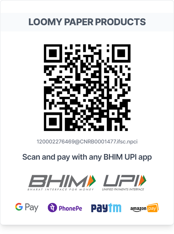 BANK DETAILS ACCOUNT NAME: LOOMY PAPER PRODUCTSACCOUNT NUMBER: 120002276469IFSC CODE: CNRB0001477BANK: CANARA BRANCH: THIRUVEGAPPURA scan here FOR MORE